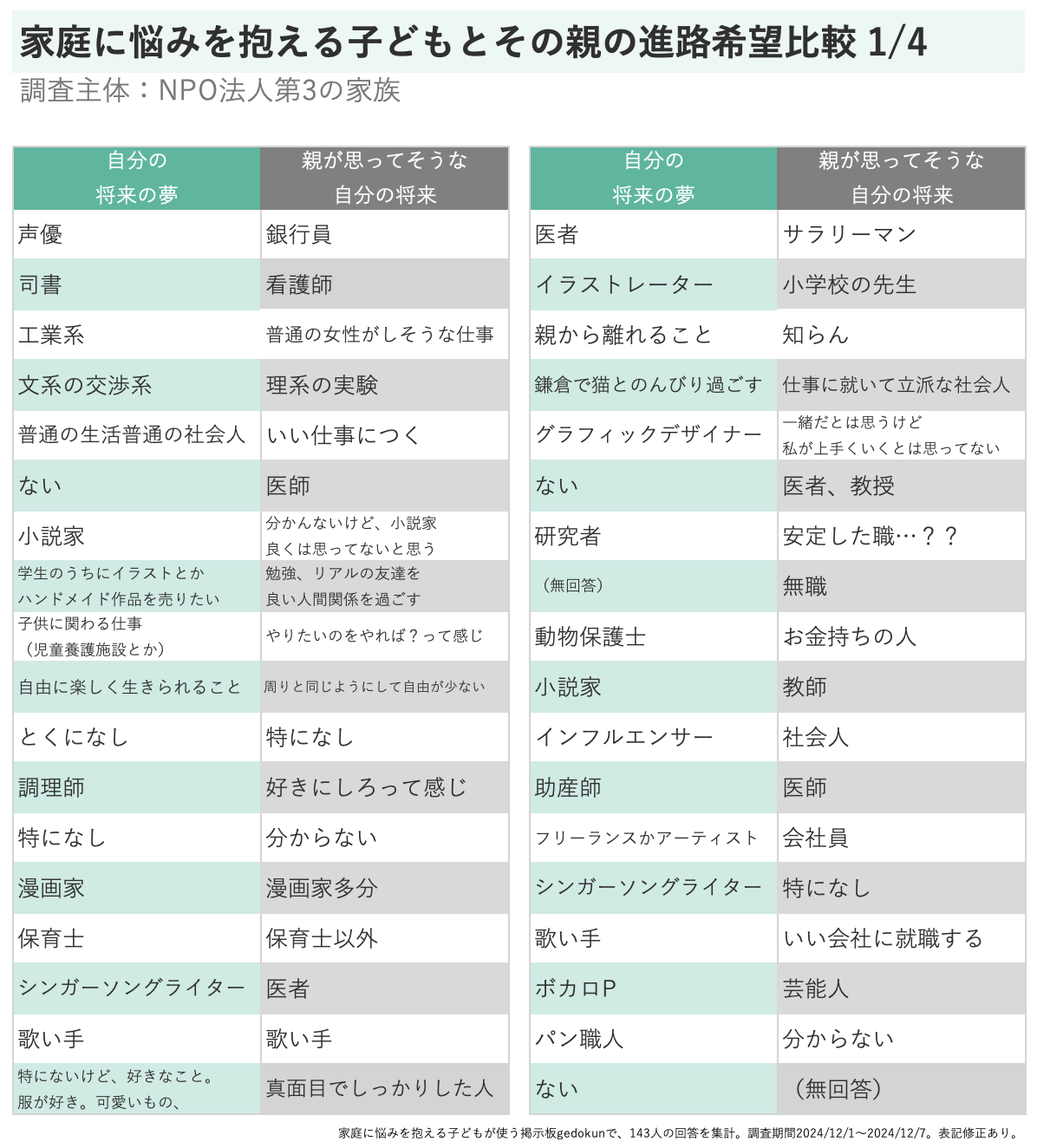 親本人の回答ではなく、子供本人からの「親が思ってそうな自分の将来」と言う回答方法のため、記憶の正確性には一定の限界がある可能性がある。