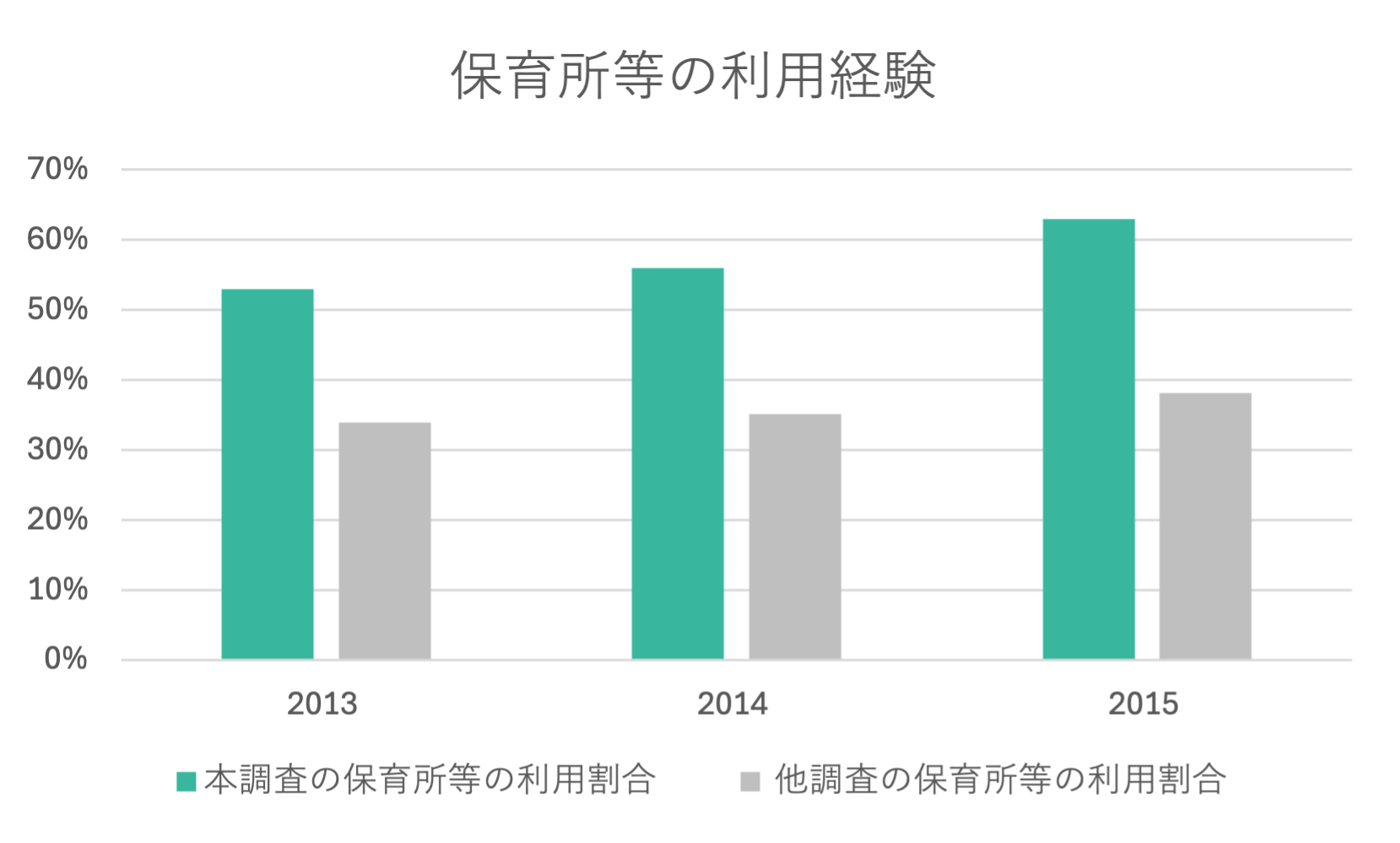 年度ごとの保育所等の利用割合を算出すると、他調査よりも20ポイント利用割合が高い(2026年2月時点)。