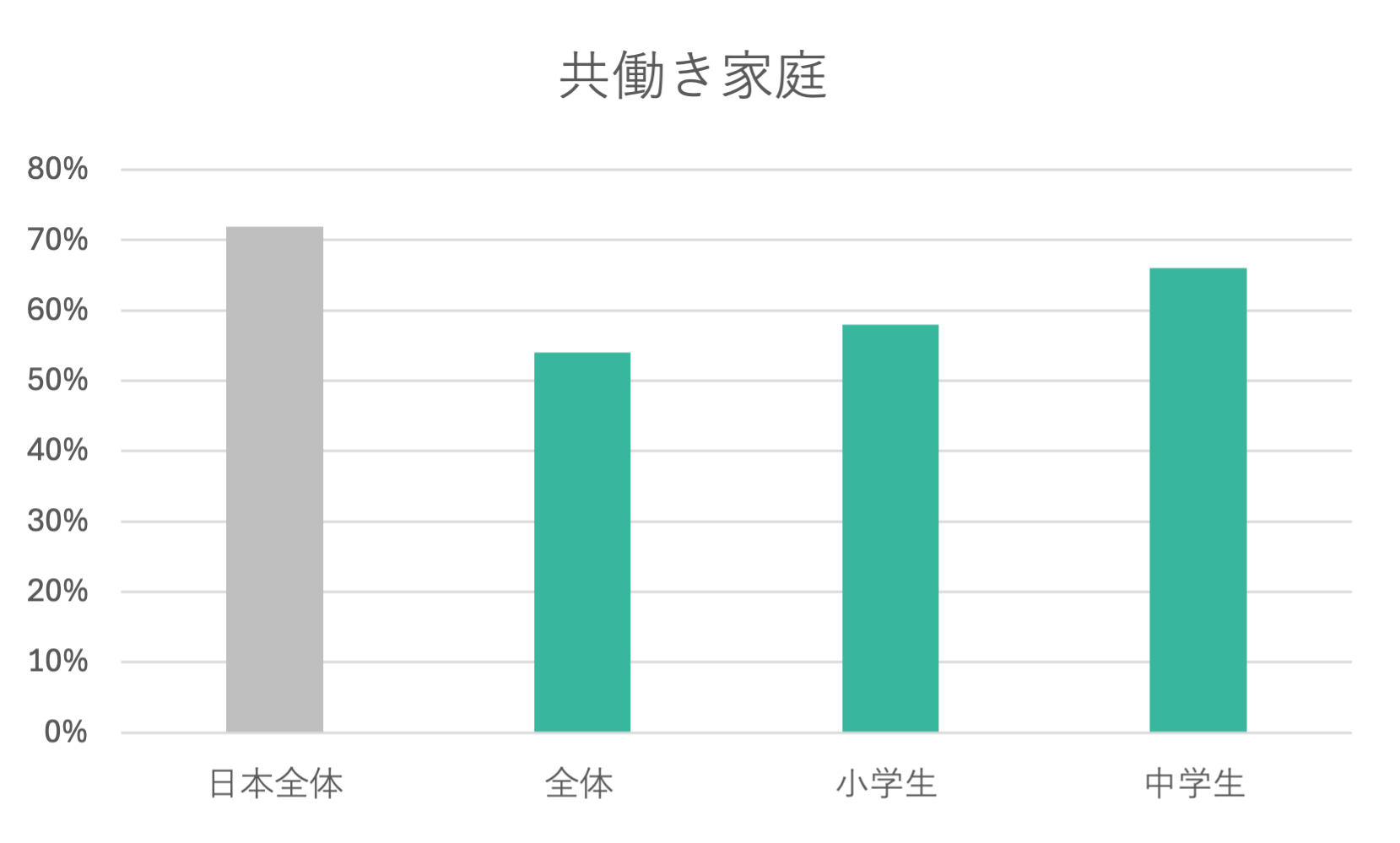 本調査は子育て世帯を対象としているのに対し、比較に用いた統計は全夫婦世帯を対象としているため、母集団が異なる。全夫婦世帯には高齢夫婦等の非就労世帯が含まれることから、子育て世帯の方が共働き率は高くなる傾向があると考えられる。そのため、本調査の結果は、調査対象世帯が一般的な子育て世帯と比較して共働きでない層を多く含んでいる可能性を示唆している。