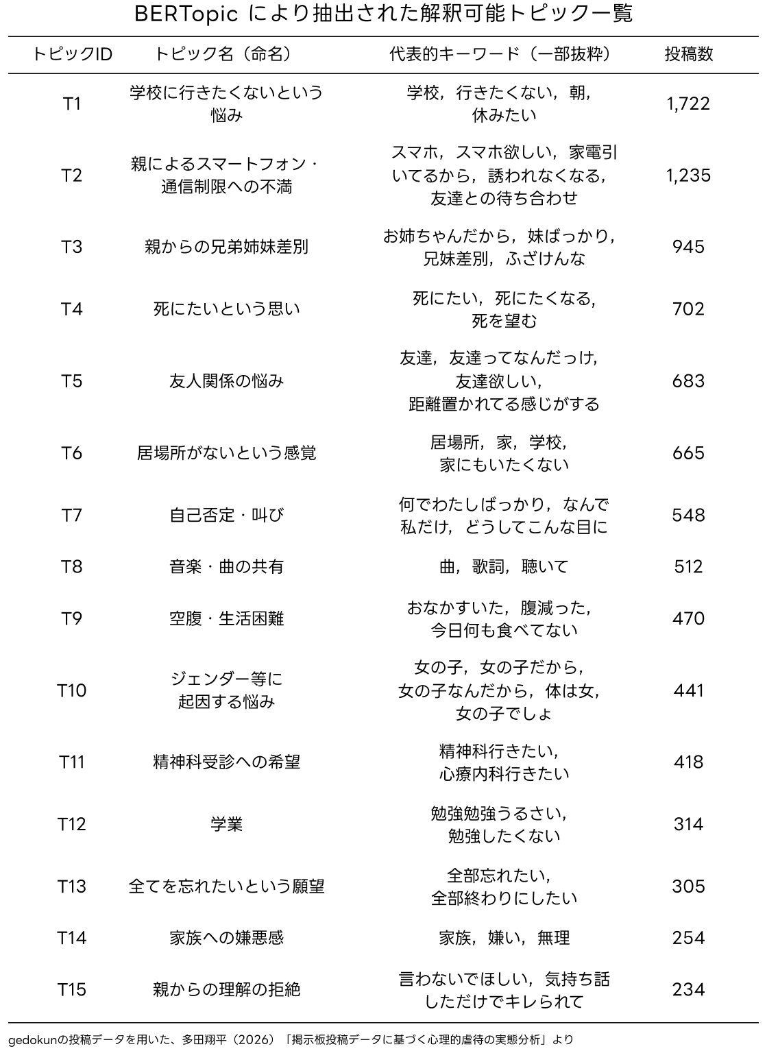 本分析結果は、多田翔平(2026)「掲示板投稿データに基づく心理的虐待の実態分析」 に基づくものである